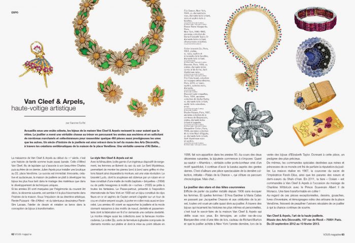 Accueillis sous une voûte céleste, les bijoux de la maison Van Cleef & Arpels ravissent le cœur autant que la rétine. Le joaillier a mené une véritable chasse au trésor en parcourant les ventes aux enchères et en sollicitant de nombreux marchands et collectionneurs pour rassembler quelque 450 pièces aussi prestigieuses les unes que les autres. Un siècle d’histoire de la joaillerie est ainsi retracé dans la nef du musée des Arts Décoratifs, à travers les créations emblématiques de la maison de la place Vendôme. Une véritable caverne d’Ali Baba…